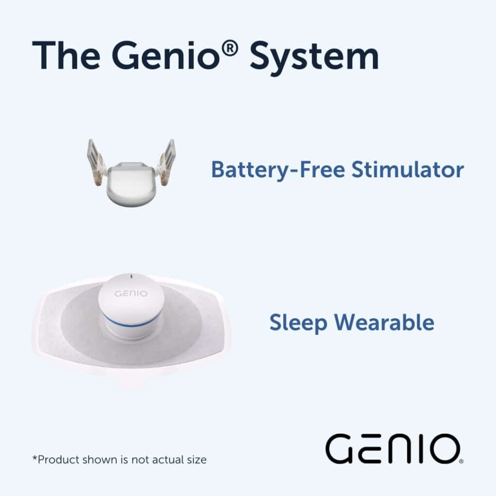 The Genio System combines a battery-free stimulator with a sleep wearable that externally powers the device. The implantable stimulator is placed under the chin during a one-time outpatient surgical procedure. The sleep wearable combines a disposable patch with an external battery, also called an activation chip, worn under the chin while sleeping. Genio therapy is activated approximately 8 weeks post procedure, when it can be controlled through an optional smartphone app that offers device usage tracking and the ability to adjust therapy within a predefined range. The activation chip is charged daily via a small portable charger wherever is convenient, even during travel.